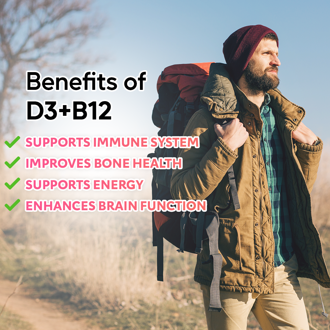 Vitamin D3 is a vital nutrient that helps to maintain strong bones, supports the immune system, and aids in the absorption of calcium. Vitamin B12 is essential for healthy brain function, nerve health, and the production of red blood cells. Both nutrients work together to support overall energy levels and contribute to a healthy mood.