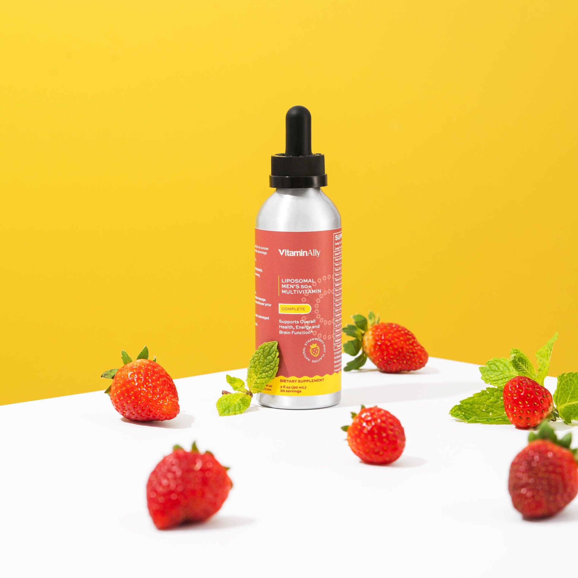 At VitaminAlly, we're committed to creating high-quality supplements that make a real difference in health and well-being. Our Liposomal Men's 50+ Multivitamin is meticulously formulated to provide the essential nutrients that men over 50 may need for a healthier and more vibrant life. With our liquid drops and delicious strawberry-mint flavor, taking daily vitamins is easier and more enjoyable.