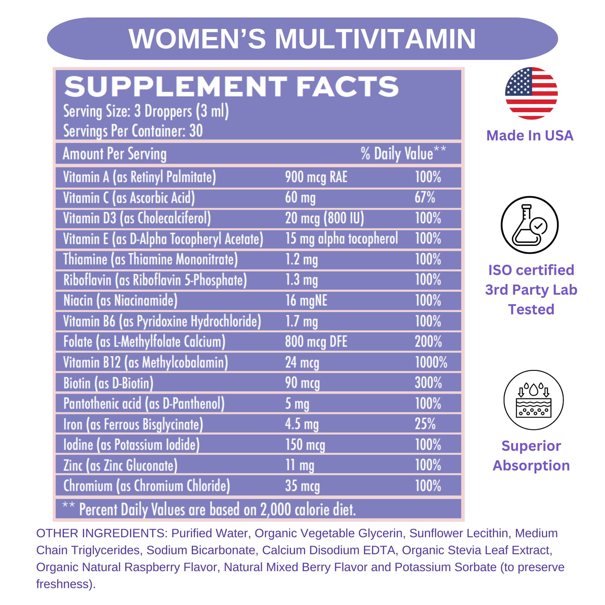 Liposomal Women's Multivitamin with Iron Liquid vitamins: Designed specifically for women, our liposomal liquid vitamins with iron provide a potent blend of essential vitamins and minerals. Packed with key nutrients, including iron, folic acid, all B vitamins, along with vitamin A, C, D, and E to support energy levels, healthy skin and hair, and overall wellness. Crafted with a liposomal delivery system, these liquid drops help ensure optimal absorption, allowing your body to benefit from the nutrients it needs.